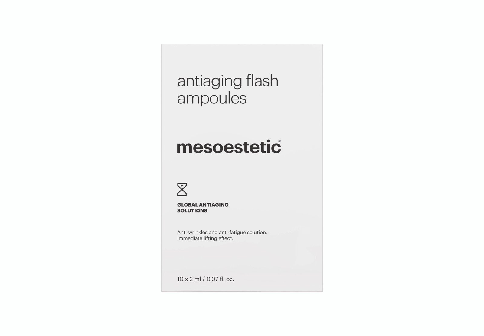 Antiaging Flash Ampoules is een behandeling die geschikt is voor een verouderde of vermoeide huid. De behandeling geeft onmiddellijk een liftend en verstevigend effect, waardoor de huid er vitaler en jeugdiger uitziet. De geconcentreerde formule bevat een combinatie van uitstekende anti-aging bestanddelen: rimpels en expressielijnen vervagen en de huid is weer soepel. De huid neemt het product door de lichte textuur snel op, waardoor de huid zacht en comfortabel aanvoelt. De behandeling is verdeeld over meerdere ampullen die de juiste hoeveelheid voor elk gebruik bevatten. De verpakking is compleet veilig en zorgt ervoor dat de bestanddelen van de formule perfect behouden blijven. Breng het product aan op een schone, droge huid voor uw gebruikelijke mesoestetic crème. Verspreid over het gelaat, de hals en de halslijn en masseer tot de crème volledig is geabsorbeerd. Het ampul kan zowel overdag als ’s avonds aangebracht worden.