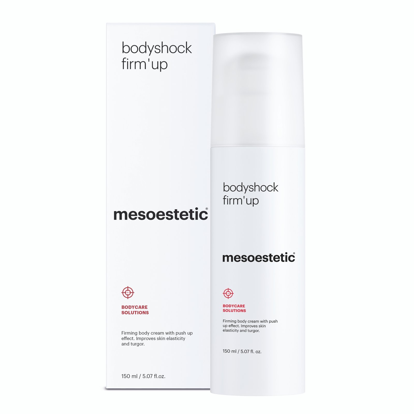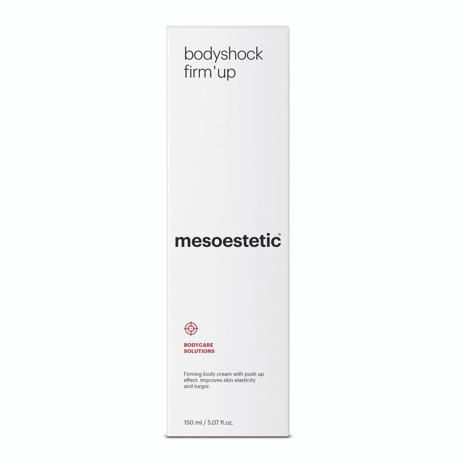 Mesoestetic bodyshock Essential Cream: white tube with black cap. Hydrating and protective body cream for stretch mark prevention.