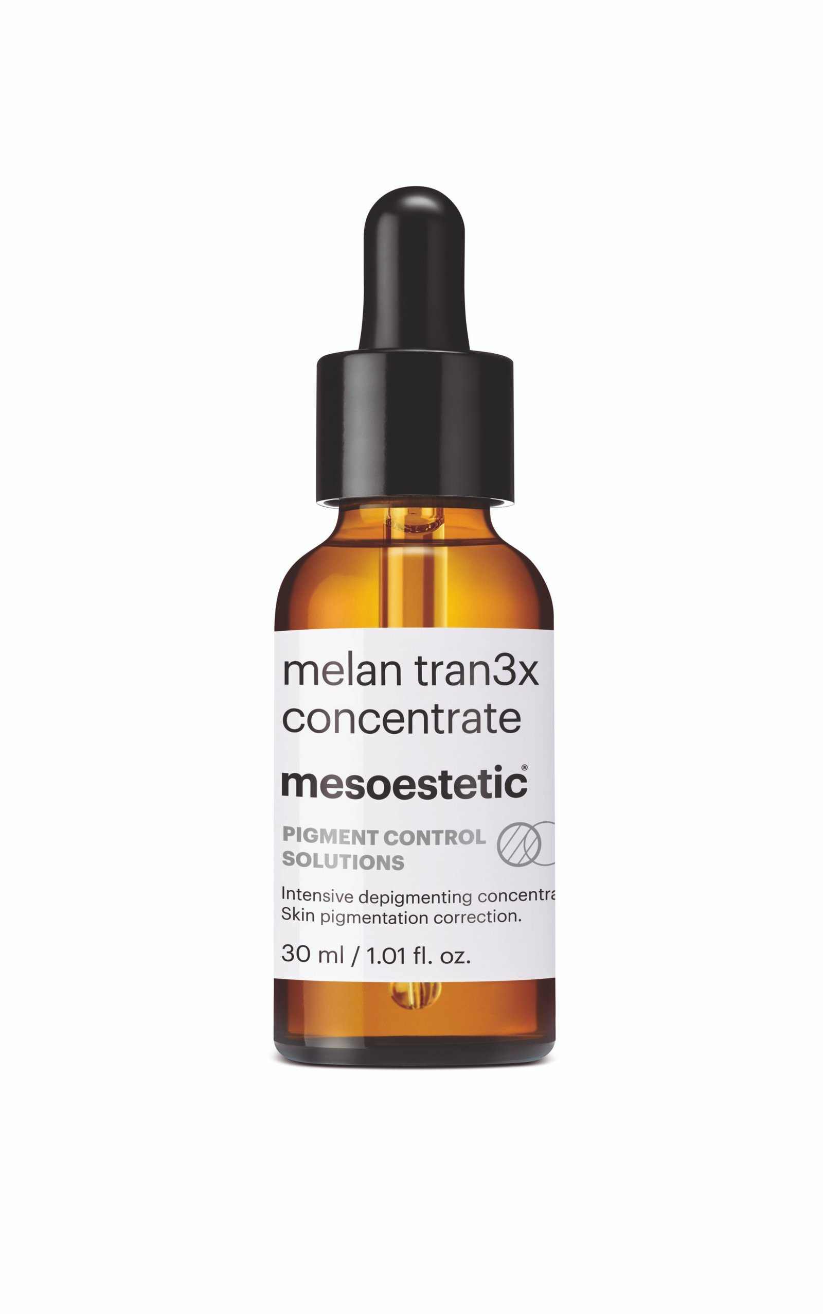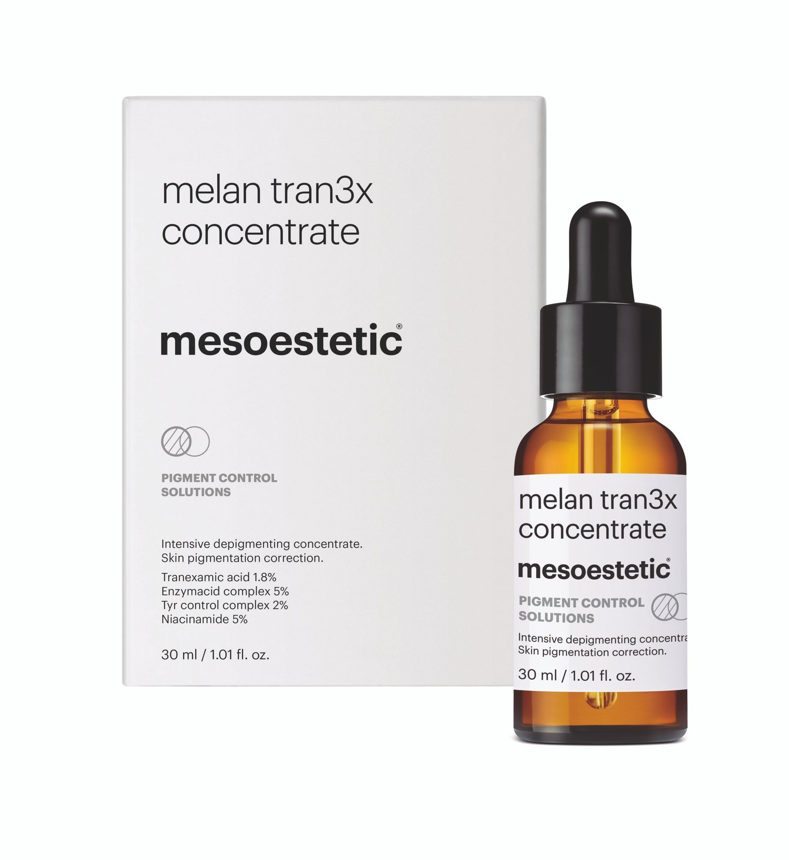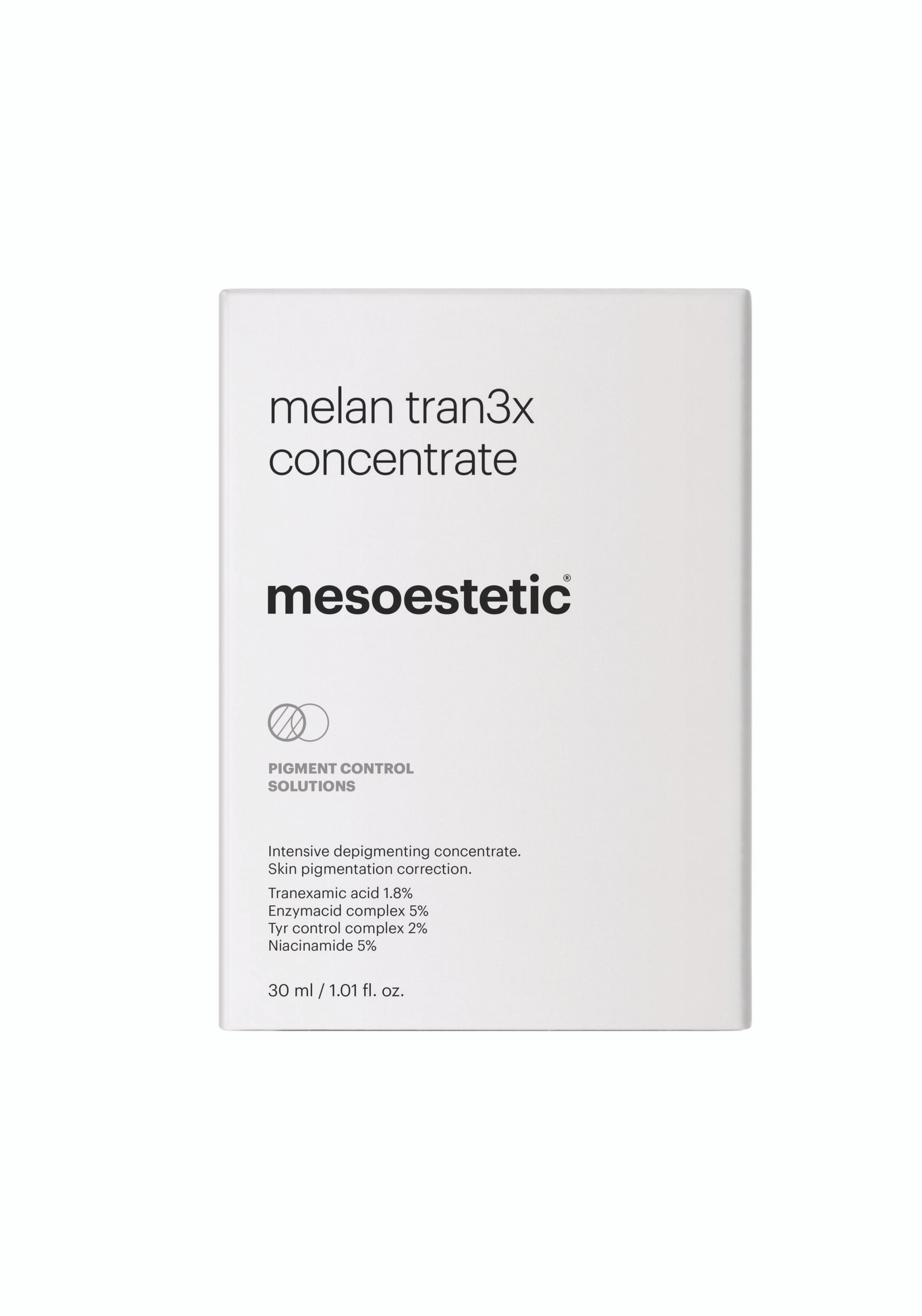 Mesoestetic Melan Tran3x Concentrate is een intensief depigmenterend middel voor dagelijks gebruik dat inwerkt op overtollige epidermale pigmentatie door het verminderen van de gevormde melanine en het zichtbaar verminderen van donkere vlekken. De ultralichte textuur maakt het mogelijk om het aan te brengen voor uw gebruikelijke crème. Aangegeven voor het verminderen van pigmentatie onvolkomenheden van welke oorsprong dan ook. Voor alle huidtypen. Geschikt na professionele depigmentatiebehandelingen (Cosmelan / dermamelan, IPL, laser, chemische peeling, etc.), om de resultaten op te voeren, te behouden en nieuwe pigmentatie te voorkomen.